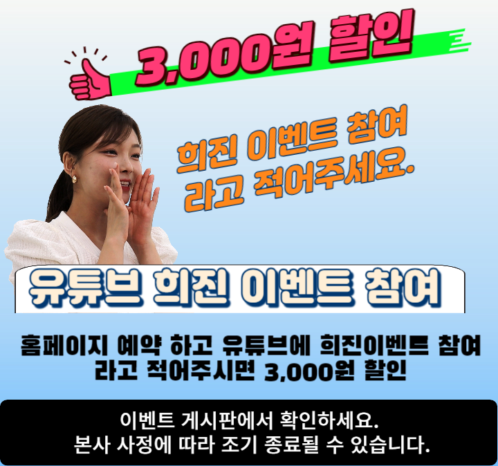 희진 이벤트 참여 후 3000원 할인받기 아래 링크에서 희진 이벤트 참여하세요!! 희진 이벤트 참여하러 가기!! 단! 사이트에서 예약 하신 고객님만 할인 혜택이 있습니다.오픈마켓 및 네이버 예약 결제는 할인 혜택이 없습니다.