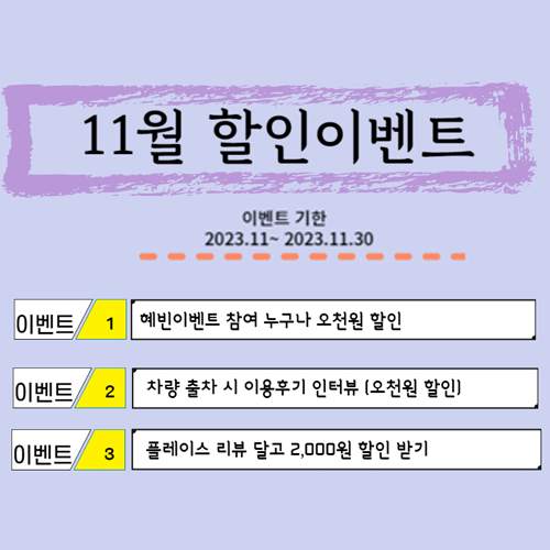 차량출고 시 인터뷰 참여하고 5000원 할인 받기 차량출고 시 인터뷰를 진행해 주시면 5000원 할인 적용됩니다.타 할인과 중복 가능인터뷰는 저희 업체를 이용 후 이용 소감을 간단하게 말씀해 주시면 됩니다. 1분 ~2분 미만으로 진행해 주시고 마스크 착용도 가능합니다.그럼 많은 이용 부탁 드립니다.[참여방법] 고객센터로 전화 또는 게시판에 인터뷰 참여 하겠다고 글을 올려 주시면 됩니다.