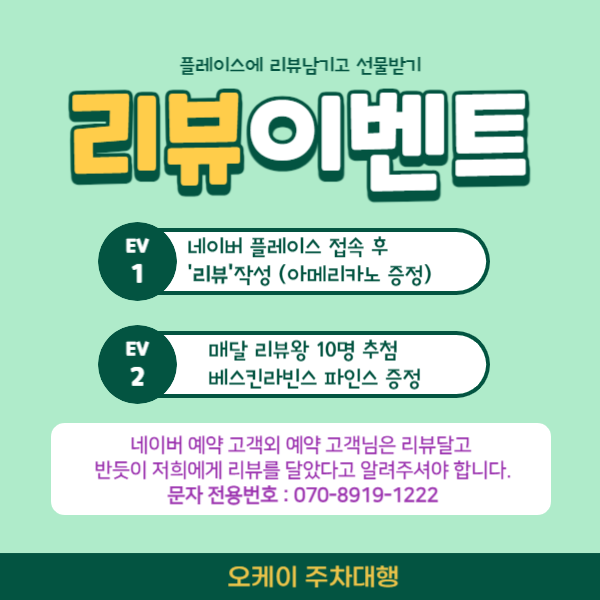 주차대행 무료로 이용하고 블로그 리뷰 쓰기 고객센터 : 02.6052.1222카카오톡으로 문의는 okays2118