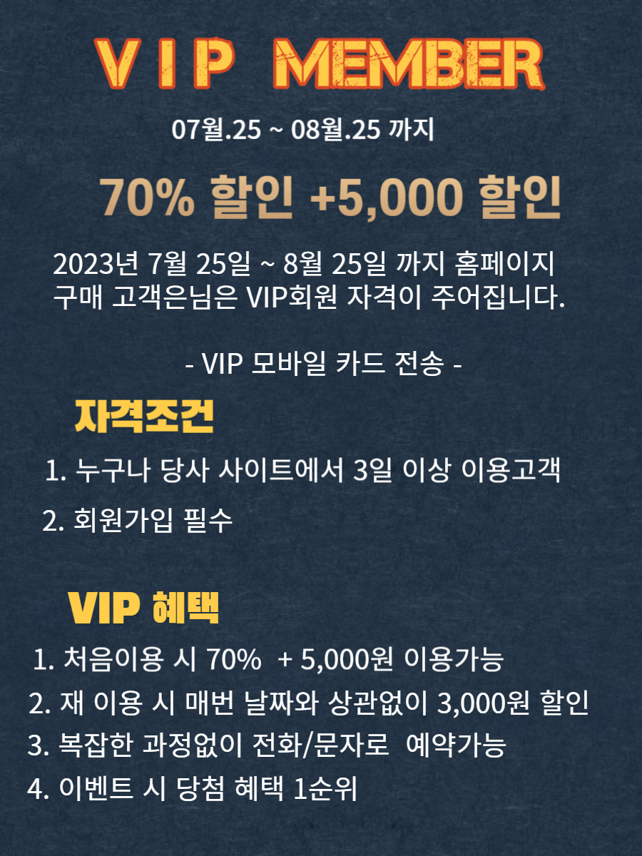 누구나 VIP회원이 될 수 있습니다. 단 이벤트 기한 내에만 적용됩니다. 2023년 7월 25일 ~ 8월25일 까지 VIP등록을 원하시면 고객센터로 연락주세요. 위 이미지를 참고 하세요.!! *추가로 예약 시 무조건 룰렛또는 번호게임을 2회 하 실수 있는 기회를 드립니다.. (룰렛/번호게임을 페이지에서 상품을 확인 하실 수 있습니다.)